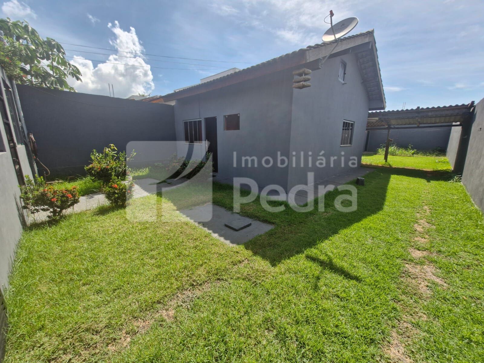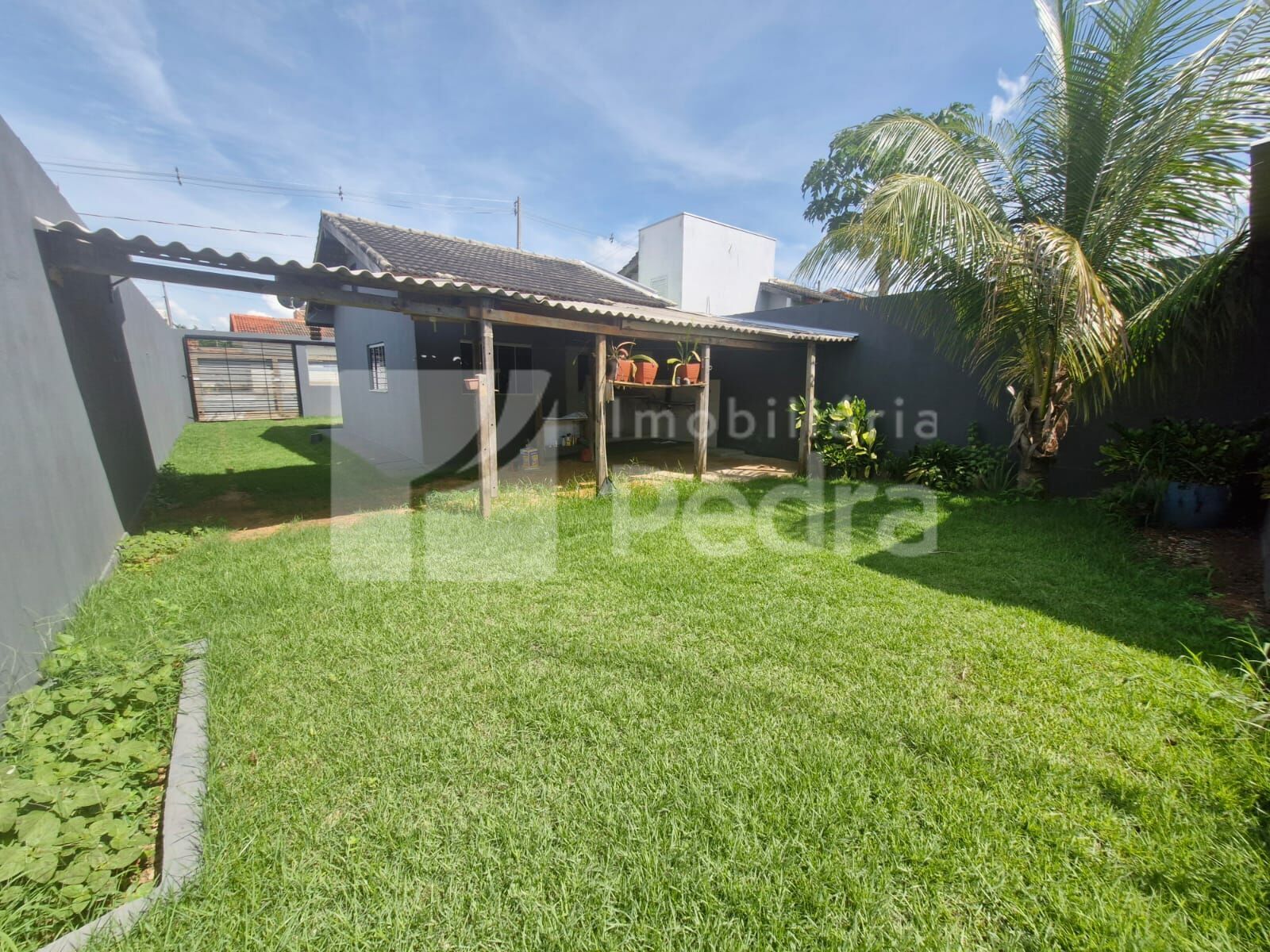 Uma casa residencial com 1 quarto, 1 banheiro social, 1 sala, 1 cozinha, 1 área de serviço, garagem coberta para 1 carro, quintal gramado na frente, fundos e lateral, teto no PVC e piso na cerâmica.